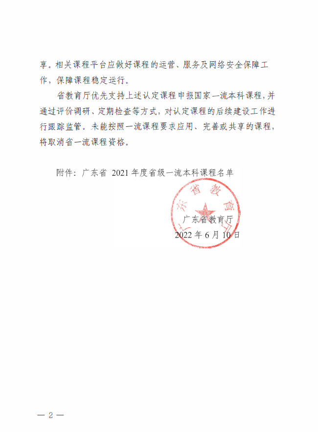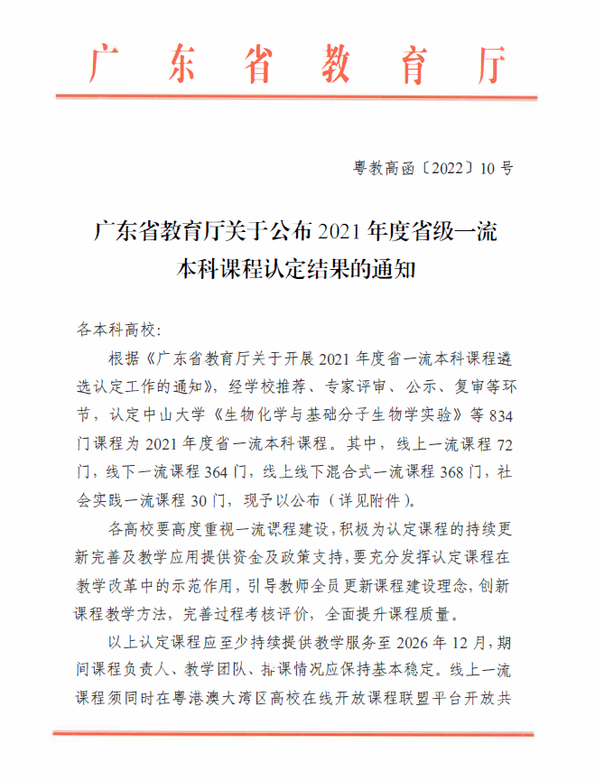 根据《广东省教育厅关于开展2021年度省一流本科课程遴选认定工作的通知》, 经学校推荐、 专家评审、 公示、 复审等环节, 认定834门课程为2021年度省一流本科课程。暨南大学共获认定省级一流课程49门,新闻与传播学院入选7门,其中线下一流课程2门,线下线上混合一流课程3门,社会实践一流课程2门。