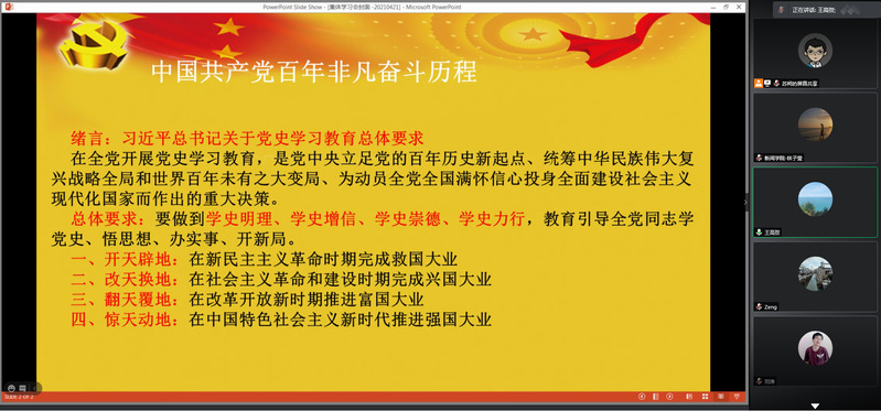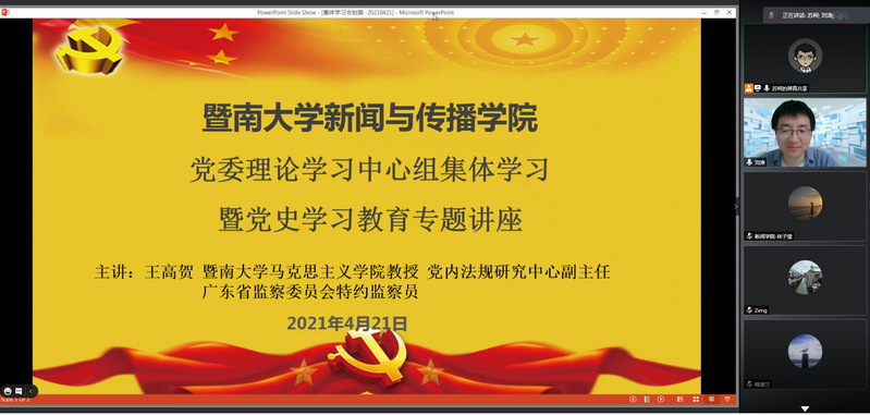 4月21日下午,新闻与传播学院党委理论中心组以线上形式召开了集体学习会议暨党史教育专题讲座。本次会议邀请到暨南大学马克思主义学院王高贺教授讲解中国共产党百年奋斗历程。此次会议由学院党委书记刘涛主持,院长支庭荣等学院党委理论学习中心组成员参加。