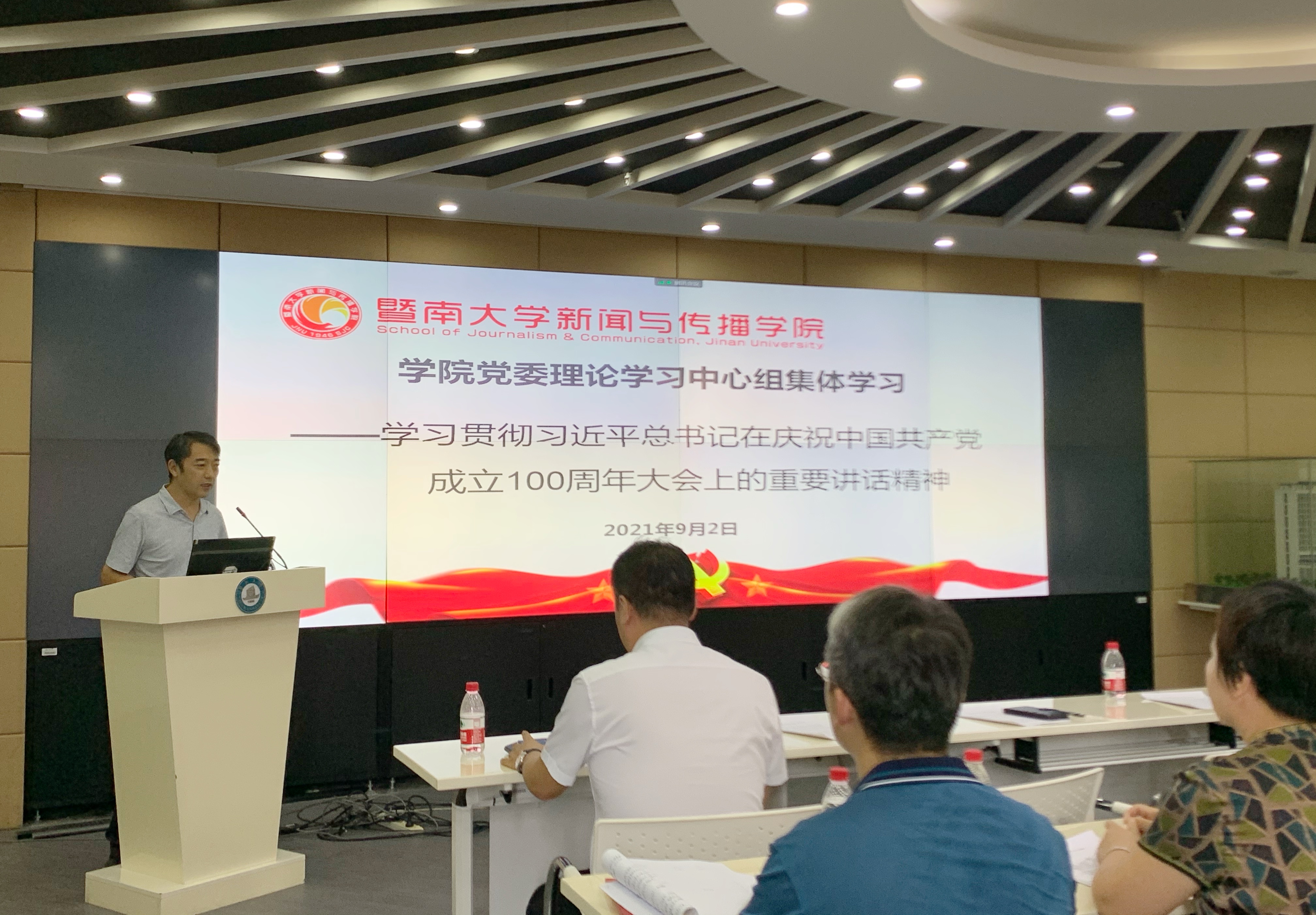 9月2日下午,新闻与传播学院党委理论学习中心组召开新学期集体学习会,进一步深入学习贯彻习近平总书记“七一”重要讲话精神。本次会议邀请了暨南大学马克思主义学院副院长魏传光,为中心组成员讲解“七一”重要讲话的本文内容和精神内涵。会议由新闻与传播学院院长支庭荣主持,学院党委理论学习中心组全体成员出席。