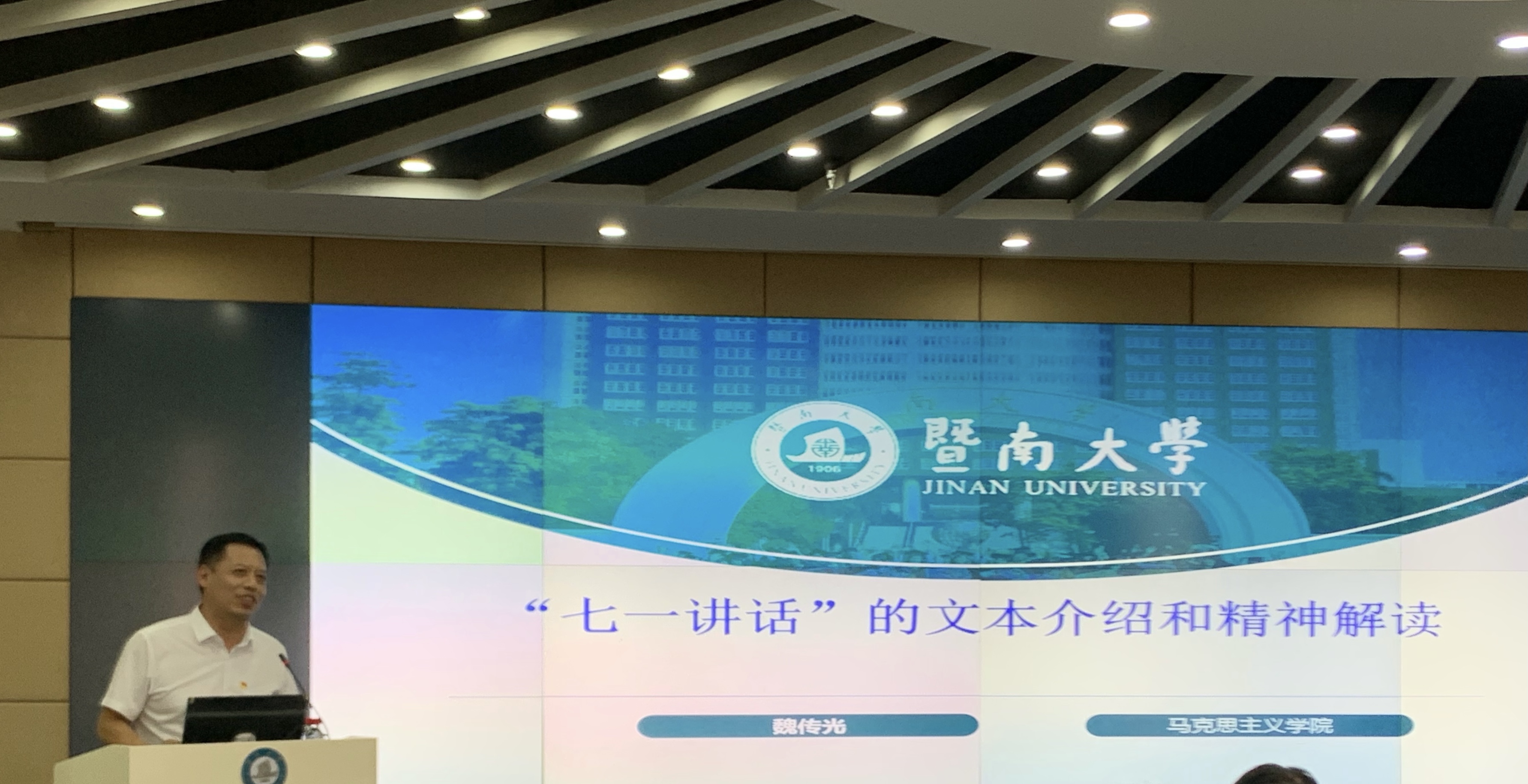 魏传光从文本介绍和精神解读两个方面对进行了深入讲解。他首先介绍了“七一”重要讲话的历史背景、贯穿主线、总体思路、历史定位与逻辑框架。他指出,是在特殊的历史节点、历史方位、内外环境和国家民族背负特殊历史使命的背景下,发表的一篇马克思主义纲领性文献,是激励全党全国各族人民向第二个百年奋斗目标进军的政治宣言和行动纲领。“七一”重要讲话回顾了中国共产党团结和带领中国人民在新民主主义革命、社会主义革命和建设、改革开放和社会主义现代化建设、创造新时代中国特色社会主义中取得的伟大成就,精辟概括了伟大的建党精神,从领导核心、价值追求、理论指引、政治方向、安全保障、外部条件、精神力量、复兴法宝与力量源泉、组织保证与政治保障九个方面,阐释了中国共产党带领中国人民实现中华民族伟大复兴的基本方略。