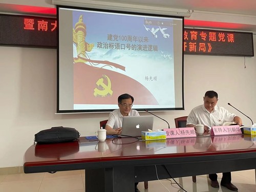 接下来教工党支部前往新兴县融媒体中心,杨先顺为县融媒体中心党员讲授了一堂生动的党课。他以《建党100周年以来政治标语口号的演进逻辑》为题,围绕新民主主义革命时期、社会主义革命和建设时期、改革开放与社会主义建设新时期、十八大以来与中国特色社会主义新时代这几个不同时期的标语口号,阐释了标语口号如何鼓舞广大人民群众积极参与到党的革命、建设、改革、发展等各项事业。他指出,各个历史时期提出的具有代表性的政治标语口号,也从另一个侧面反映了党走过的百年的风雨历程。政治标语口号对于宣传党的思想、方针和政策,动员党员和群众投身到时代洪流中,发挥了重要作用,彰显了使命演进逻辑。通过此次学习,党员们纷纷表示将进一步增强党性修养,提高自己业务本领和综合素质,为宣传新兴贡献力量。