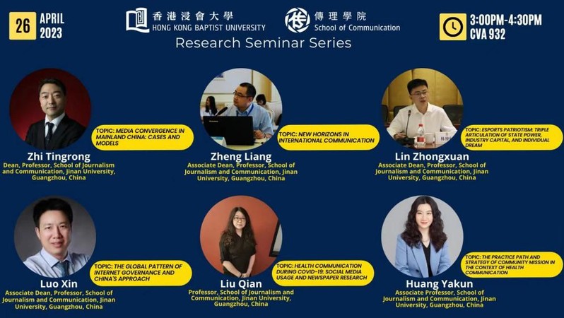 4月26日下午,我院教师受邀在香港浸会大学传理学院进行了关于媒体融合、国际传播研究、电竞爱国主义、互联网治理、健康传播等主题报告,之后与浸会大学传理学院各系负责人及教师沟通最新研究议题与进展成果。