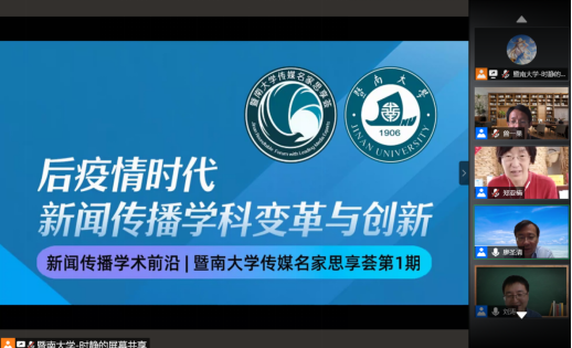 9月20日下午2:30,“暨南大学传媒名家思享荟第1期”如期在云端举行,来自中国传媒大学、云南大学、复旦大学、浙江大学、南京大学、陕西师范大学、南京师范大学、河南师范大学、黑龙江大学、暨南大学等学校新闻与传播领域的几位著名学者应邀出席首期“暨南大学传媒名家思享荟”,围绕后疫情时代新闻传播学科变革与创新的议题展开了热烈讨论。本次会议由暨南大学新闻与传播学院教授刘涛主持,来自全国各地近三百余名师生共同参与了这次圆桌论坛。
