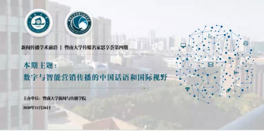 11月26日下午14:30,“暨南大学传媒名家思享荟第4期”在腾讯会议如期举行,来自中国传媒大学、北京大学、中国人民大学、厦门大学、武汉大学、深圳大学、上海外国语大学、华中科技大学和暨南大学等高校的专家学者,就“数字与智能营销传播的中国话语和国际视野”的议题展开了深入的交流和探讨。本次会议由暨南大学新闻与传播学院杨先顺教授主持,来自全国各地的二百余名师生共同参与了本次的圆桌论坛。