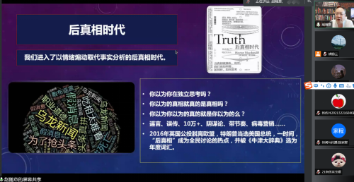 从英国学者赫克托·麦克唐纳的《后真相时代》一书介入,赵教授指出,我们已进入了以情绪煽动取代事实分析的后真相时代。他发问,你以为你在独立思考吗?你以为的真相就真的是真相吗?从2016年英国公投脱离欧盟、特朗普击败希拉里当选美国总统开始,一时间,“后真相”成为了全民讨论的热点,并被《牛津大辞典》选为当年年度词汇。这一段时间内,新闻报道进入了事实最为混乱的时期,被谣言、流言、误传、阴谋论裹挟着的真相在一次又一次的反转中失去了其本来的面目。赵教授调侃道,西方的新闻简直就是当成小说来写。而小说作为创作作品与揭示新闻真相的新闻作品截然相反、背道而驰。从后真相背后折射出的,是新闻工作者完全失去了职业道德操守,以及被政治利益和资本诉求高度捆绑束缚的乱象。