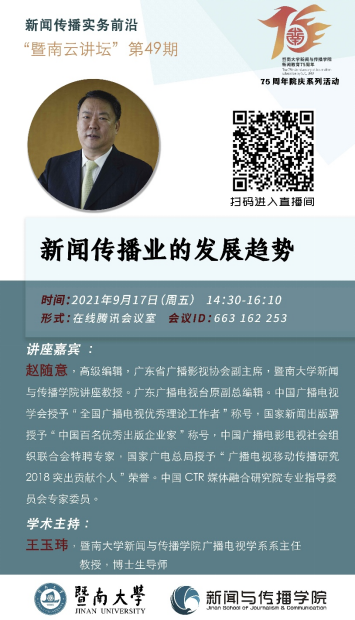 2021年9月17日下午14:30,广东省广播影视协会副主席、暨南大学新闻与传播学院讲座教授赵随意应邀来到第49期“暨南云讲堂”,为暨南大学新闻与传播学院师生作了主题为《新闻传播业的发展趋势》的精彩云讲座,分享了他对于新闻传播业的当下困境与变革方向的深刻洞见与思考。本次讲座由暨南大学新闻与传播学院广播电视学系系主任、博士生导师王玉玮教授主持,来自暨南大学新闻与传播学院的200多名专硕研究生听取了本次讲座。