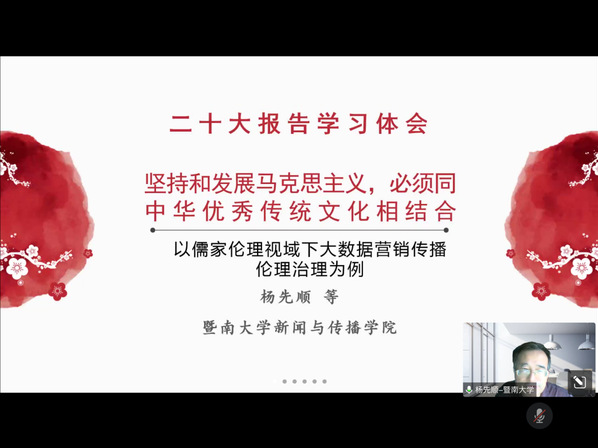 20221122日下午,暨南大学新闻与传播学院传播学研究生党支部采用腾讯会议的形式,召开以党的二十大精神为主题的党课学习活动。本次活动邀请到新闻与传播学院党委委员、暨南大学传播与国家治理研究院杨先顺院长讲授党课,带领支部成员学习贯彻党的二十大精神,学深悟透党的二十大精神内涵。与会党员、发展对象和积极分子共74名,会议由支部组织委员唐明真同志主持。