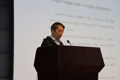 支庭荣宣读大会选举办法和总监票人、监票人、计票人名单,无异议后,宣布大会需选举产生的中国共产党暨南大学第十一次代表大会代表名额,并宣读候选人名单并简要介绍候选人情况。
