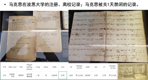 根据时间顺序,陈力丹讲述了马克思的小学(家庭教育)、中学教育、婚恋和大学教育经历,分享了马克思在弗里德里希-威廉中学学习内容和评语。“马克思在中学扎实的学习,掌握的知识相当丰富。1833年,15岁的他留下的两首诗,第一首《人生》(menschenleben),已折射了他的思想潜力;第二首《查理大帝》(auf karl den groβen),展现了他对文明传播的向往和肯定”,陈力丹讲道。1835年马克思第一次离开自己的故乡,赴波恩大学读书。“马克思在波恩大学学习不错,这里同时也是他初步走社会的开始”,陈力丹通过视频向大家展现现在波恩大学主楼、教室、法律系、学生活动广告和法律社团、名人档案馆等状况,也展示了马克思当年在该校的注册、离校记录和马克思被关1天禁闭的记录。而柏林大学时期,是马克思形成自己思想的年代。陈老师详细描述了马克思柏林大学期间的学习生活情况,考察了柏林大学(现洪堡大学)法律系楼里、法律系外的倍倍尔广场的社会主义书摊、柏林大学主楼内的马克思语录和马克思在柏林的8个住所遗址。陈力丹介绍:“马克思在柏林大学上了13门课。整个1839年和1840年初,忙于为写博士论文而阅读和作摘录。这些笔记的内容非常广泛,包括当代哲学家的莱布尼茨、斯宾诺莎、休谟。马克思笔记中最有意义的段落是他论述黑格尔的世界哲学之后的哲学氛围,他认为当前哲学已经到达了一个转折点。马克思论文获得了较高的评价,当时有位教授称‘看到他考虑了当时可以得到的如此多的材料几乎令人震惊’。而获得博士学位后1841-1842年的马克思,为生存而奔波,1841年7-12月他在波恩,结识了影响他后来发展的几个关键人物。从大学后半期到大学毕业后的一段时期,马克思周围的人都注意到他未来是一个出色的人。”陈力丹他详细描述了马克思在波恩大学和柏林大学期间的学习生活情况,以及这段经历如何塑造了他的思想基础。