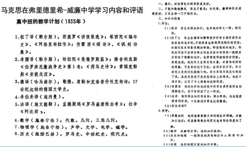 图3:马克思在弗里德里希-威廉中学学习内容和评语(来自陈力丹教授讲座ppt)
