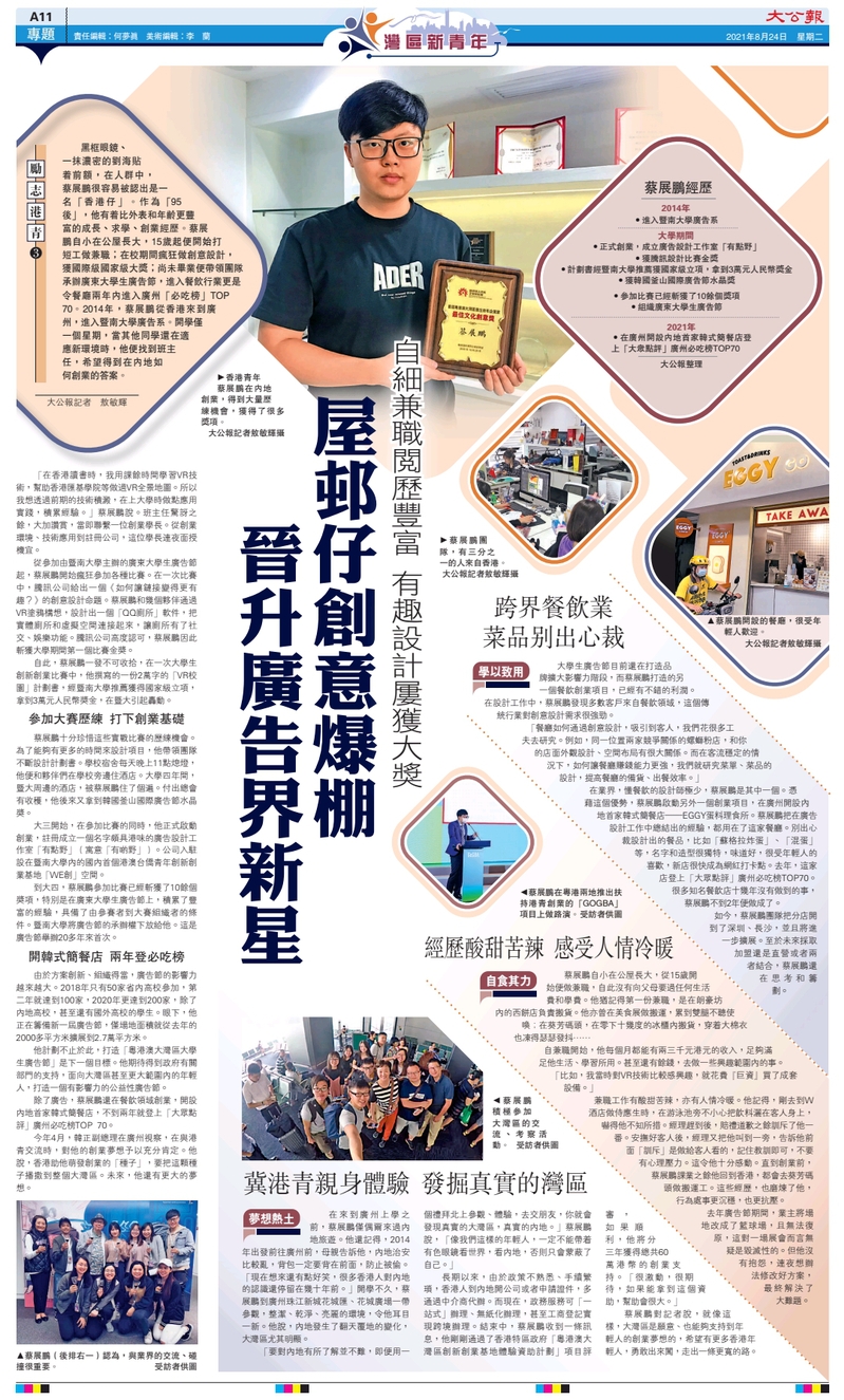 8月24日,暨南大学新闻与传播学院广告学系2014级校友蔡展鹏的励志创业事迹获得了香港《大公报》的整版报道。报纸使用整个版面讲述了暨大广告校友蔡展鹏在大湾区的奋斗成长、励志求学、创业进取的经历与感悟。